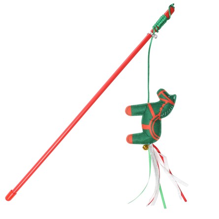Яркая и функциональная удочка-дразнилка с кошачьей мятой - это всегда актуальный аксессуар для усатых-полосатых. Такая удочка и развлекает питомца, и дрессирует одновременно, помогая кошке также держать мыщцы в тонусе, развивать сообразительность и реакцию. Изделие имеет прочную основу и декорирована оригинальными элементами в новогодней стилистике. Подвижная игрушка на шелковистом шнуре с мелодичным бубенчиком и яркими ленточками привлечет даже самых пассивных кошечек, вовлекая их в процесс веселой охоты. Удочка "Лошадка" станет оригинальным подарком вашему любимцу к Новому году! Цвет: красно-зеленый. Размер игрушки: 90*85*15мм. Длина палки: 400мм.