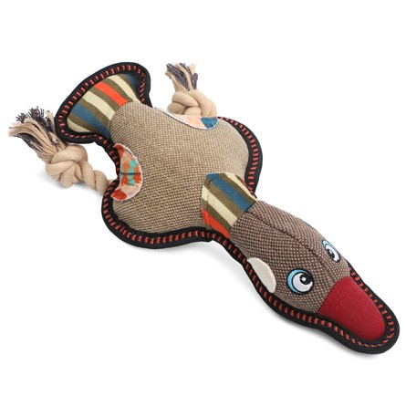 Эта очаровательная мягкая игрушка для собак с пищалкой внутри выполнена из канвы и полиэстера с хлопковой веревкой-перетяжкой. Благодаря прикрепленной веревке эта игрушка отлично подходит для тяговых игр с питомцем, дрессировки и натаски. Игрушка "Утка с веревкой" доставит огромную радость собакам и их заботливым владельцам! Цвет: бежево-коричневый. Размер: 330*140*50мм.