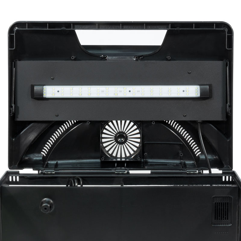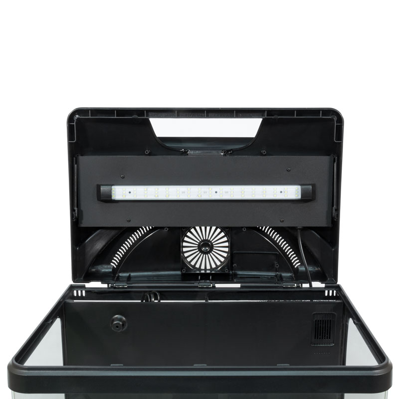 Аквариум из тонированного стекла 18,9л со встроенным в крышку светодиодным светильником 2,8Вт. Цвет светодиодов - белый/синий. 2 режима освещения - дневной и ночной. Включение и выключение освещения производится простым прикосновением руки к крышке.