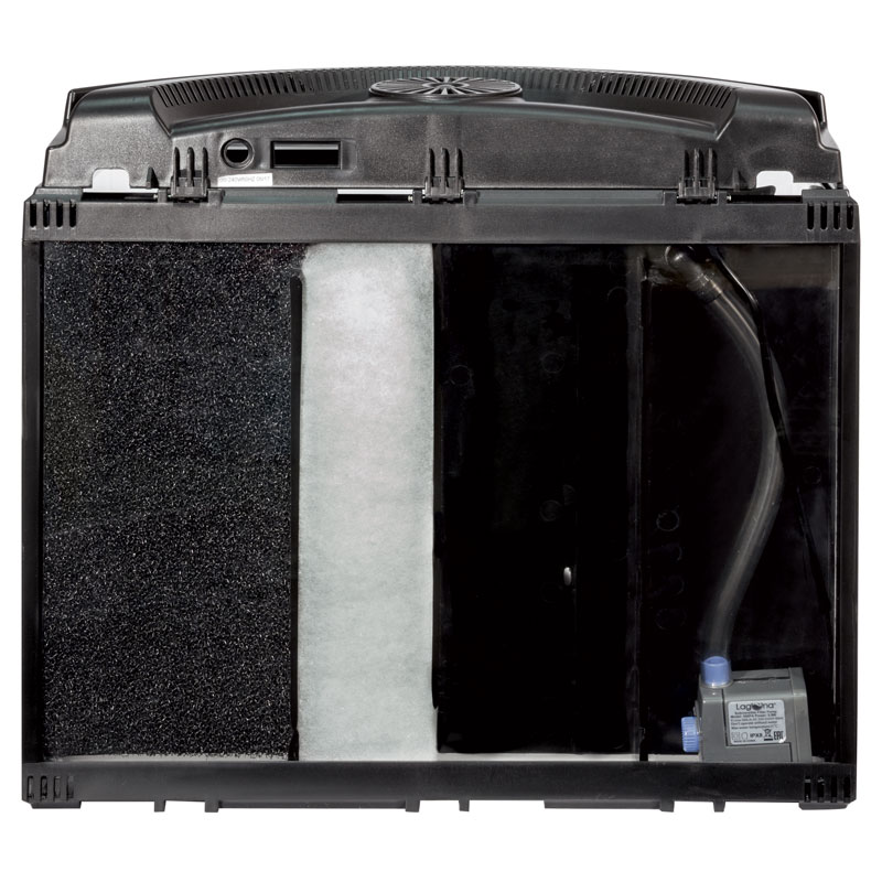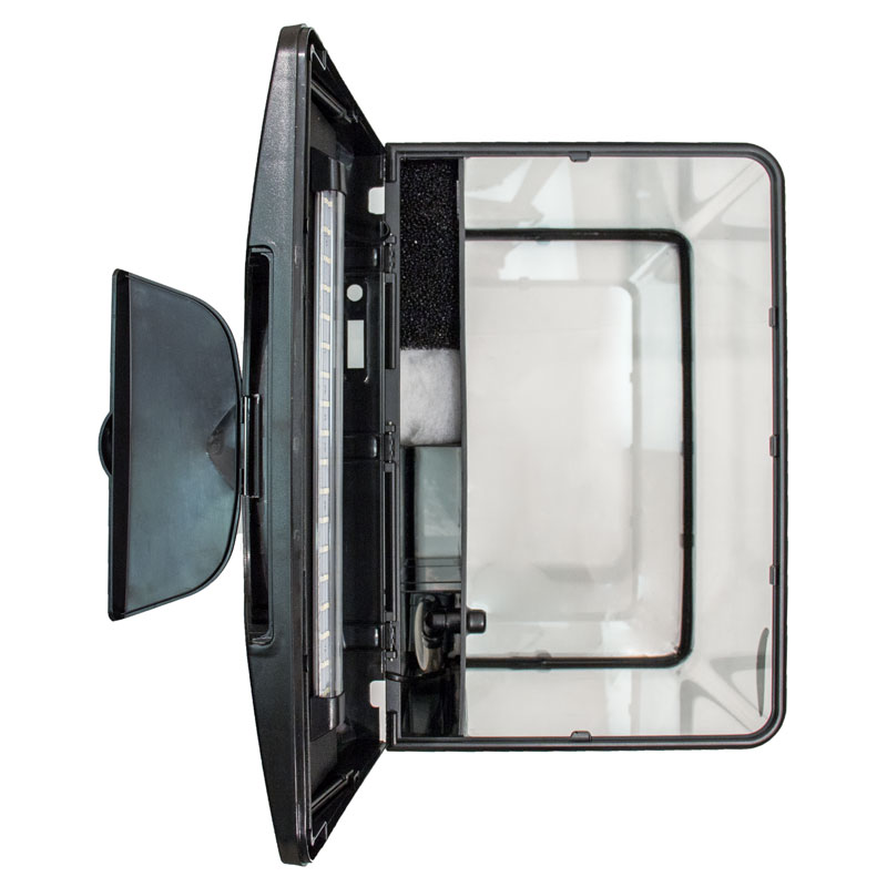 Аквариум из прозрачного стекла 9,4л. В комплекте покровное стекло. В фильтрующем отсеке аквариума расположена помпа мощностью 5Вт, 208л/ч для подачи воды в каскад,а также фильтрующий материал. В верхней части фильтрующего отсека размещены два контейнера для посадки растений.