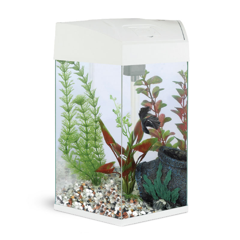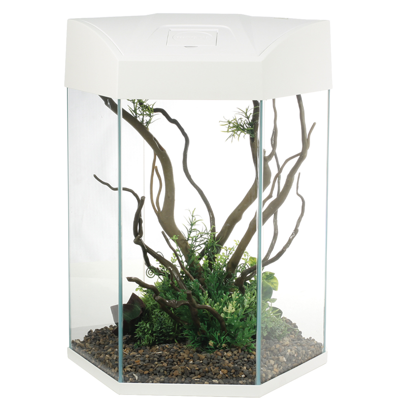 Классический шестигранный аквариум из силикатного стекла, цвет - белый. В комплекте: светильник 1*5Вт, помпа 200л/ч, биофильтр.