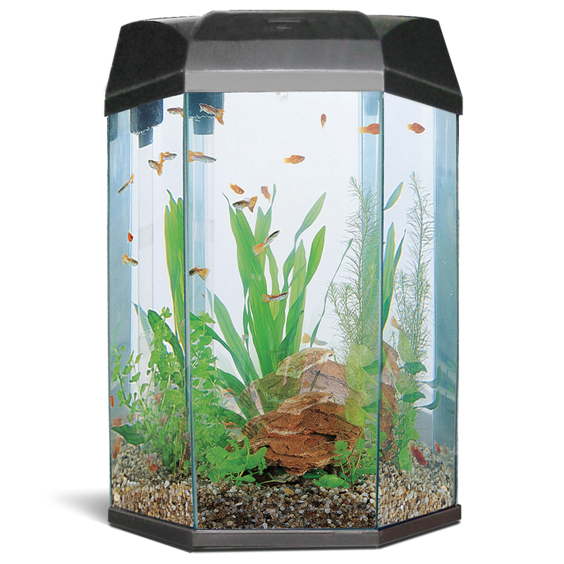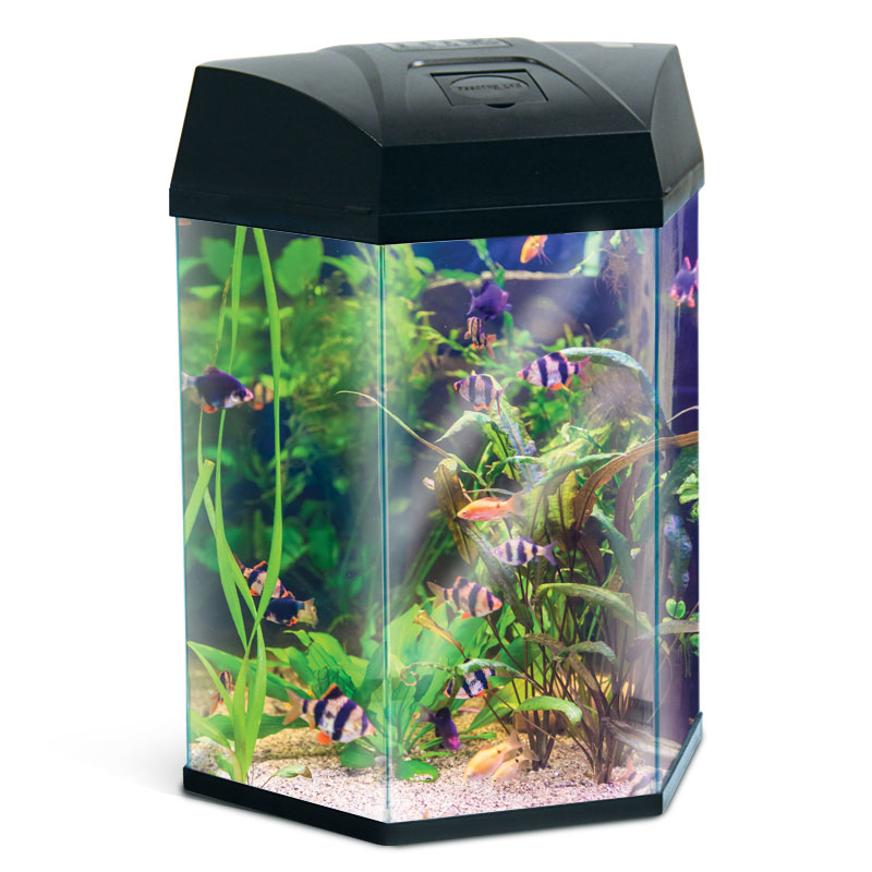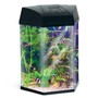 Классический шестигранный аквариум из силикатного стекла; цвет - черный. В комплекте: светодиодный светильник 1Вт (6 ярких светодиодов белого цвета), помпа 200л/ч, биофильтр.