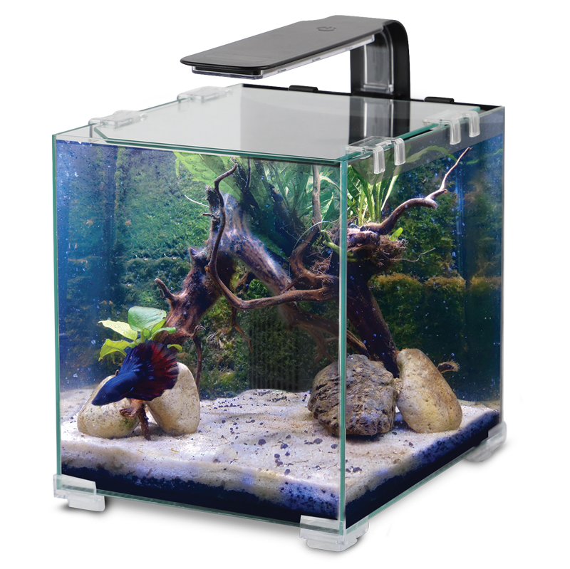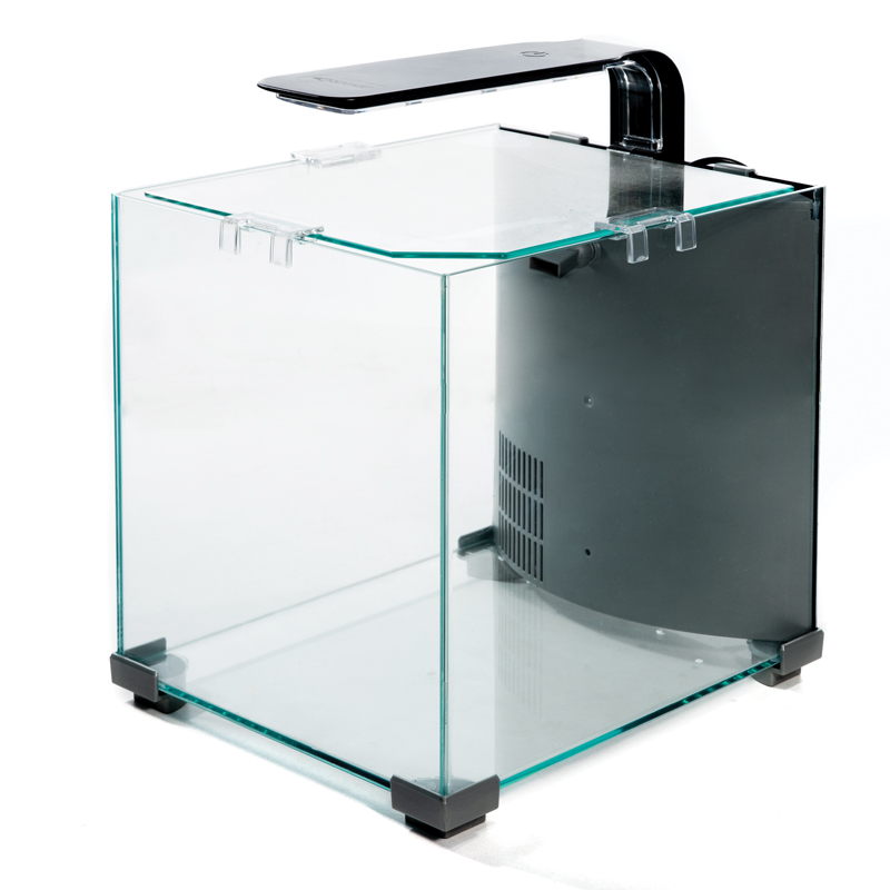 Аквариум из прозрачного стекла 9,4л. В комплекте покровное стекло. В фильтрующем отсеке аквариума расположена помпа мощностью 5Вт, 208л/ч для подачи воды в каскад,а также фильтрующий материал. В верхней части фильтрующего отсека размещены два контейнера для посадки растений.