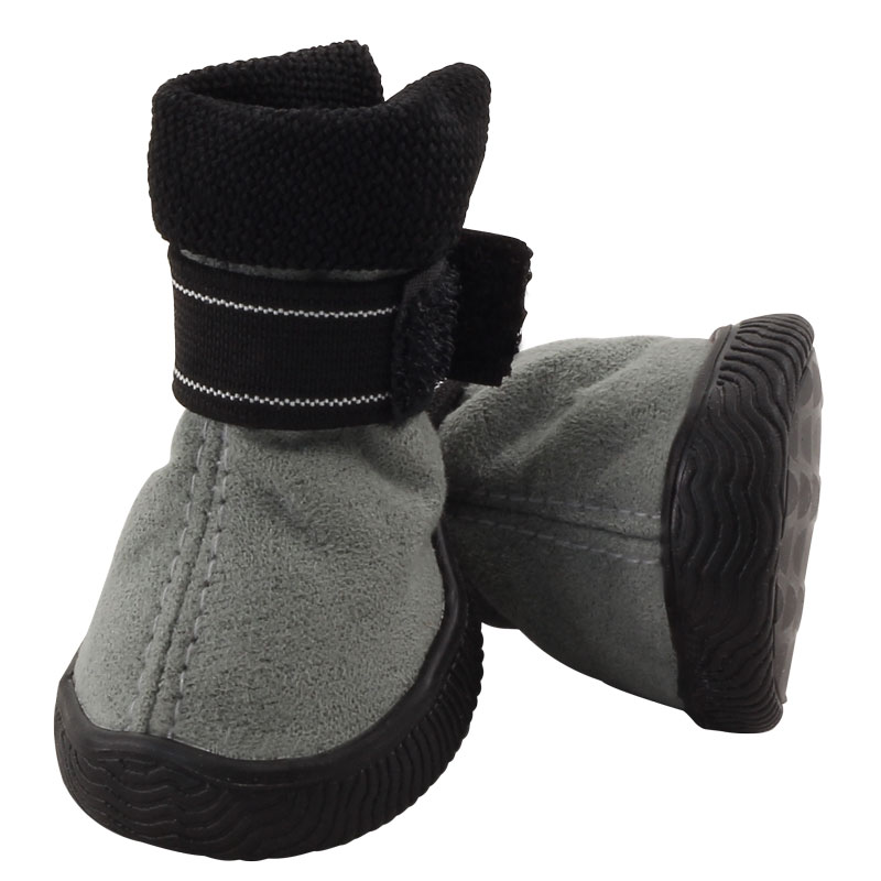 Комплект замшевых ботинок для собак с функциональной прорезиненной подошвой - незаменимый аксессуар индивидуальной защиты лап животного от воздействия агрессивных жидкостей, дорожных химреагентов, бензинов и масел на проезжей части дорог. Прочные, комфортные и непромокаемые, они сохраняют лапы собаки чистыми и сухими в ненастную погоду и защищают их от истирания о твердое покрытие при длительных и интенсивных нагрузках. Размер изделия: 30х30х40 мм. Цвет: серый.