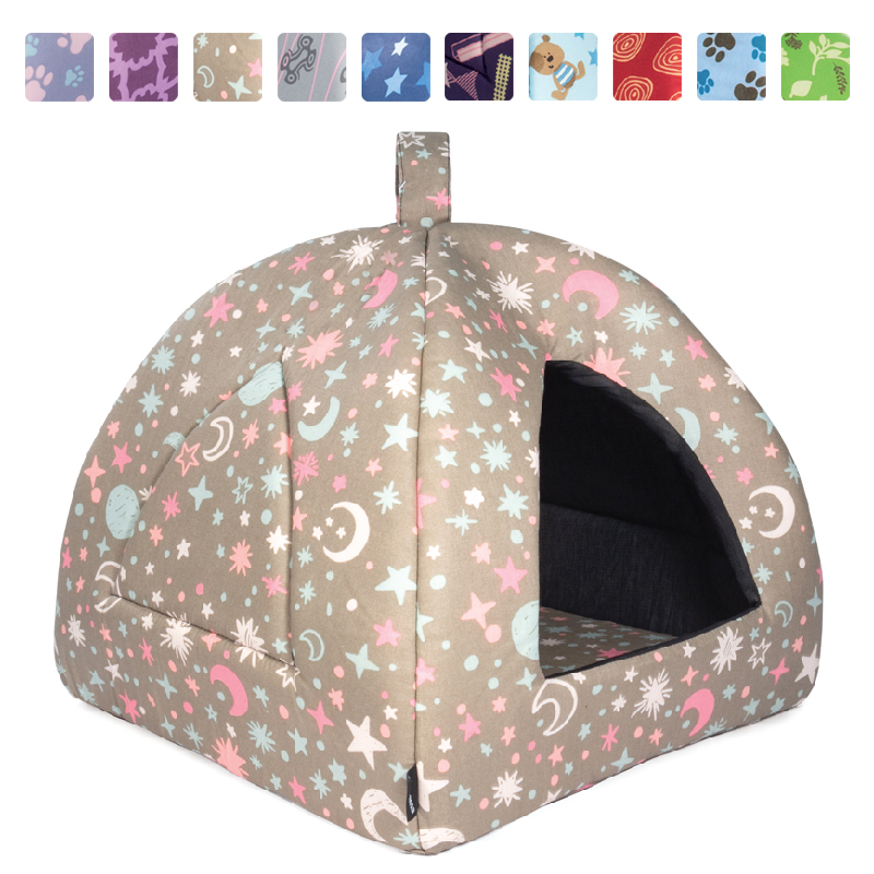 Оригинальный домик, визуально напоминающий виг-вам. Поролоновый каркас отлично держит форму. Внутри - съемная мягкая подушка. Размер изделия: 370*370*340мм. Цвета в ассортименте.