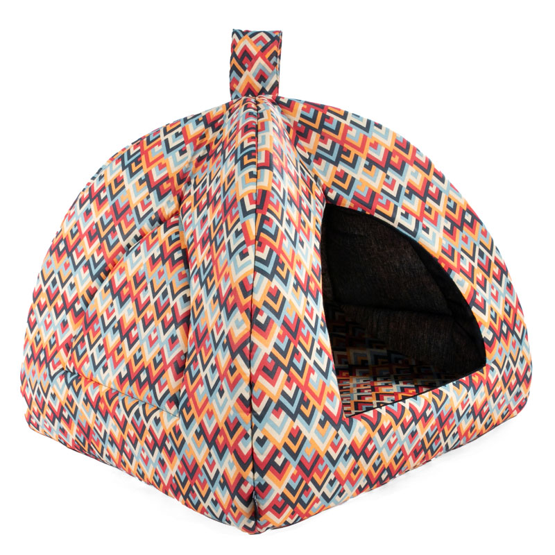 Оригинальный домик, визуально напоминающий виг-вам. Поролоновый каркас отлично держит форму. Внутри - съемная мягкая подушка. Размер изделия: 370*370*340мм. Цвета в ассортименте.