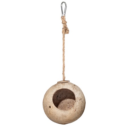 Кокос - прекрасный натуральный материал, отличающийся прочностью и простотой в исполнении любых задумок производителей. Натуральный природный материал - это залог здоровья и гарантия хорошего настроения вашего питомца. Крепление: карабин. Цвет: коричневый. Размер: d105-120мм; длина 300мм.