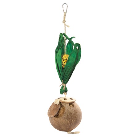 Игрушка для птиц, выполненная из кокоса, наполненного кокосовым волокном. Верхняя часть состоит из плетеного шара, завернутого в кукурузные листья. Крепление: карабин. Размер: 425/455*d110мм.