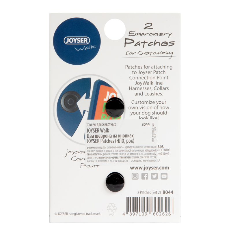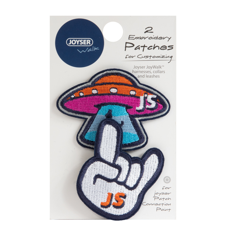 Два шеврона на кнопках JOYSER Patches (с вышивкой "НЛО" и "рок") для сменного передника шлейки для собак JOYSER Mood Harness Customized-Shirt.