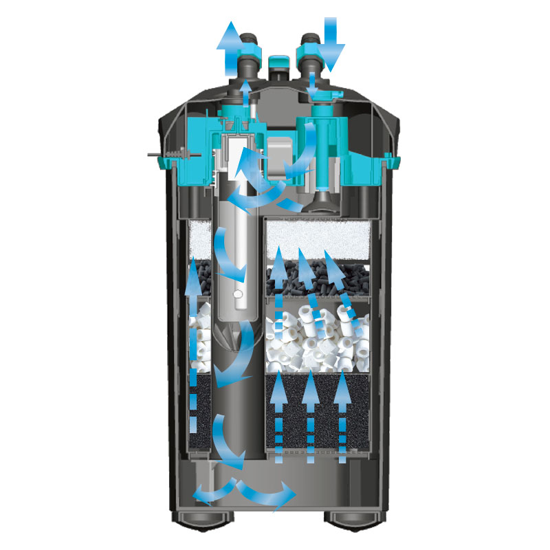 Внешний фильтр повышенной мощности отличается эффективностью и простотой эксплуатации. Производительность модели - 850л/ч, мощность - 9,3Вт. Импеллер фильтра оснащен керамической осью, которая обеспечивает долгую службу ротора и тихую работу фильтра, а также дает возможность использовать фильтр как для пресноводных, так и для морских аквариумов. Встроенный насос ручной подкачки облегчает запуск фильтра. В комплект поставки входит полный набор для подключения фильтра (краны на вход/выход, шланги 16/22мм на вход/выход, защитная решетка заборной трубки, присоски, флейта с заглушкой). Фильтр имеет две фильтрационные корзины с фильтрующими материалами (губками) для грубой и тонкой очистки воды.