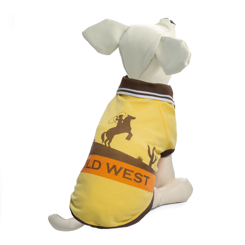 Футболка-поло "Дикий Запад" - это стильный и функциональный аксессуар для собак на каждый день. Изделие отличается удобным для питомца кроем и оригинальным воротничком, застегивающимся на две кнопки. Футболка надевается через голову. На рукавах предусмотрены удобные резинки, фиксирующие изделие на лапах животного, а универсальный фасон не стесняет движений питомца во время прогулки. Длина по спинке: 200мм; обхват груди: 340мм; обхват шеи: 240мм. Цвет: желтый.