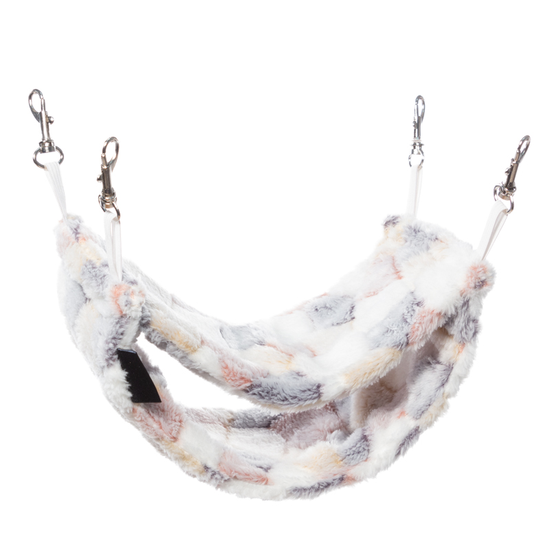 Гамак размерами 20х34 см изготовлен из качественной фланелевой ткани с наполнением из прессованного синтепона, благодаря чему он мягкий, теплый и уютный. Изделие оборудовано шестью прочными карабинами, при помощи которых его можно зафиксировать в необходимом положении внутри клетки любых габаритов. В таком гамаке вашему любимцу будет максимально комфортно: он сможет скрыться от глаз и спокойно поспать в мягкой лежанке. Изделие легко стирается как вручную, так и с помощью стиральной машинки. Варианты расцветок лицевой стороны - в большом ассортименте.