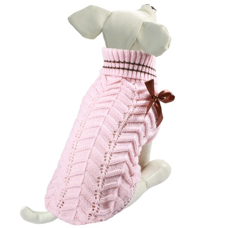 Свитер нежной расцветки и оригинальной вязки с украшением в виде банта - это удобный и функциональный аксессуар для собак, который просто незаменим в холодную погоду. Изделие защитит вашего питомца от ветра и согреет в непогоду, а универсальный фасон не будет стеснять движений питомца во время прогулки. Свитер прекрасно сидит на животном благодаря специальным лямочкам для задних лап, и манжетам для передних. Такой свитер со стильным дизайном станет украшением гардероба вашего питомца. Материал: акрил. Цвет: розовый. Размер: 20см (XS).