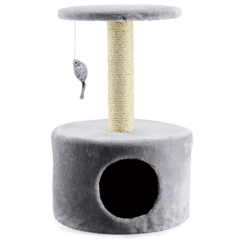 Игровой комплекс для кошек с уютным плюшевым домиком - идеальное времяпрепровождения для вашего пушистого питомца. Домик имеет вход круглой формы (d180мм), столбик-когтеточка и верхняя платформа с игрушкой для отдыха и игр. Цвет комплекса: серый. Столбик d70*340, полка d300, вход 180мм. Размер комплекса: d380*610мм.