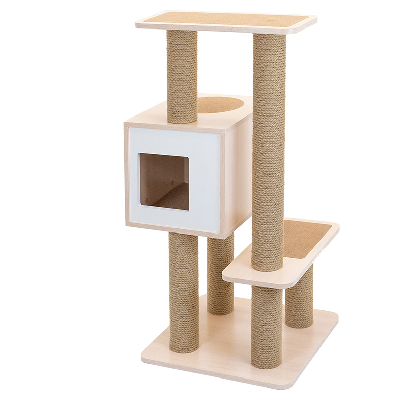 Многоярусный игровой комплекс для кошек с 2 платформами, уютным домиком и 4 столбиками-когтеточками - идеальное решение для обеспечения досуга вашего питомца. Комплекс выполнен из ламинированного МДФ - практичного, надежного, изящного и экологичного материала. Горизонтальные платформы обиты оригинальным утапливаемым ковролином. Цвет: бежевый.