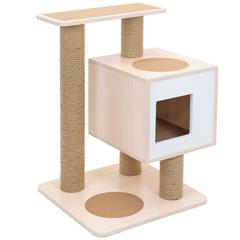 Многоярусный игровой комплекс для кошек с платформой, уютным домиком и 3 столбиками-когтеточками - идеальное решение для обеспечения досуга вашего питомца. Комплекс выполнен из ламинированного МДФ - практичного, надежного, изящного и экологичного материала. Горизонтальные платформы обиты оригинальным утапливаемым ковролином. Цвет: бежевый.