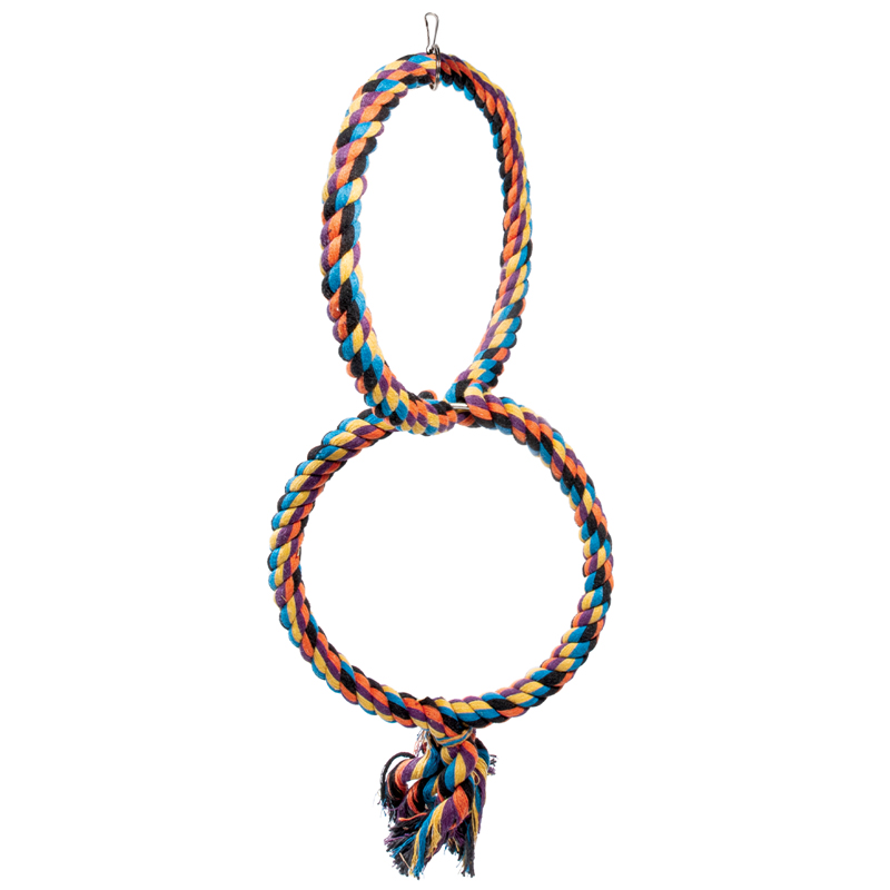 Качели два кольца для птиц с карабином для крепления. Верёвочные игрушки необходимы каждой птице. Птица не только точит когти и клюв, она может лазить по ним, укрепляя мышцы и поддерживая свой организм в тонусе. Верёвочные игрушки вызывают у птиц неподдельный интерес. Цвет: разноцветный. Размер: d180мм/460мм.
