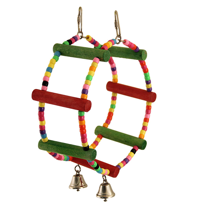 Игрушка-качели для птиц в виде колеса из бус и множества жердочек в нем и 2ух колокольчиков. Крепление: 2 карабина. Цвет: в ассортименте. Размер:250*70*80мм.