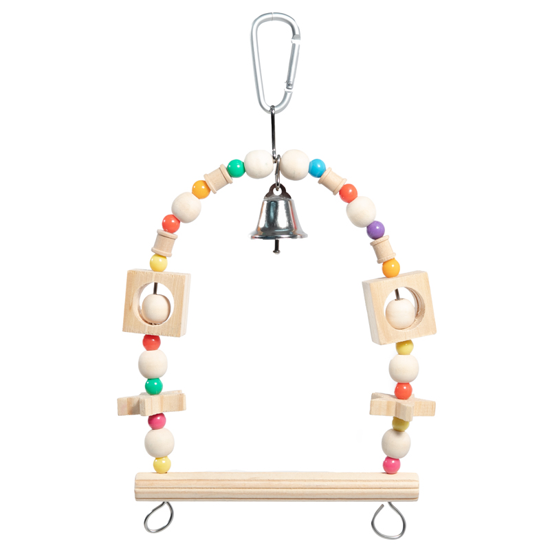 Игрушка-качели для птиц в виде колеса из бус и множества жердочек в нем и 2ух колокольчиков. Крепление: 2 карабина. Цвет: в ассортименте. Размер:250*70*80мм.