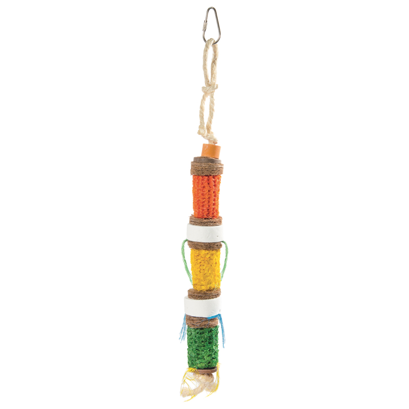 Игрушка для птиц, выполненная из початков кукурузы с прослойкой из кокоса и минерального камня. Крепление: карабин. Размер: 290/380*d40мм.