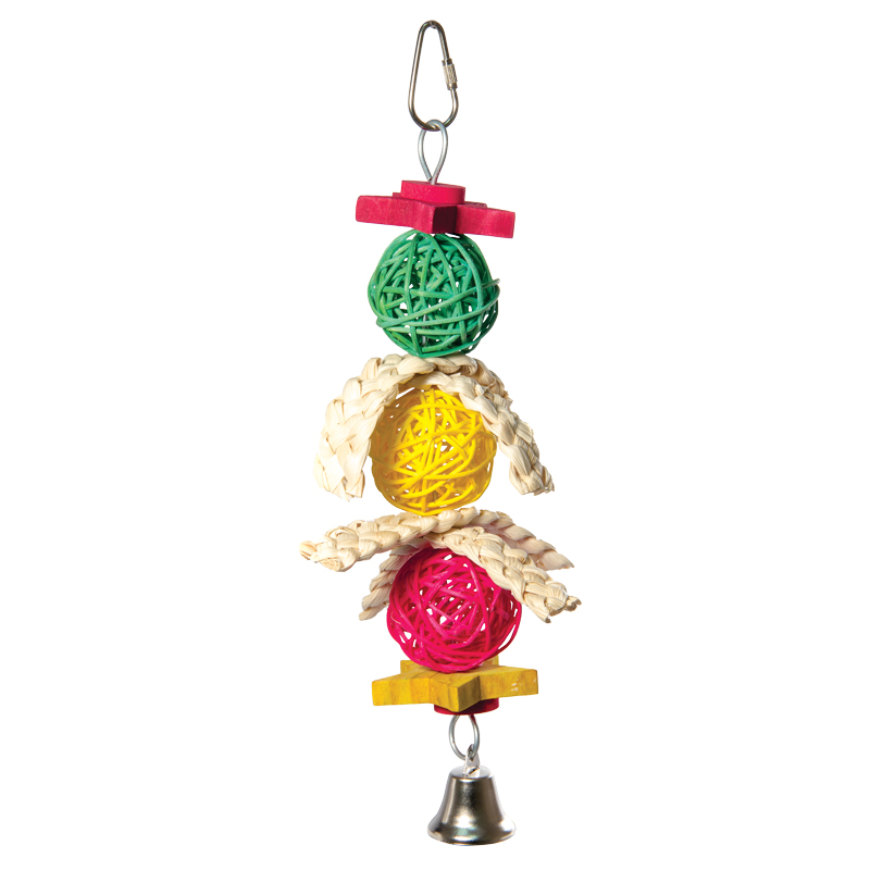 Игрушка для птиц в виде трех плетеных шариков, двух деревянных звезд и колокольчика. Крепление: карабин. Цвет: в ассортименте. Размер: 240/280*110мм.