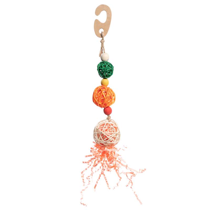 Игрушка-подвеска для птиц в виде трех плетеных шариков, цветных деревянных деталей и хвостика из бумаги. Крепление: деревянный крючок. Цвет: разноцветный. Размер: 215/270*45мм.