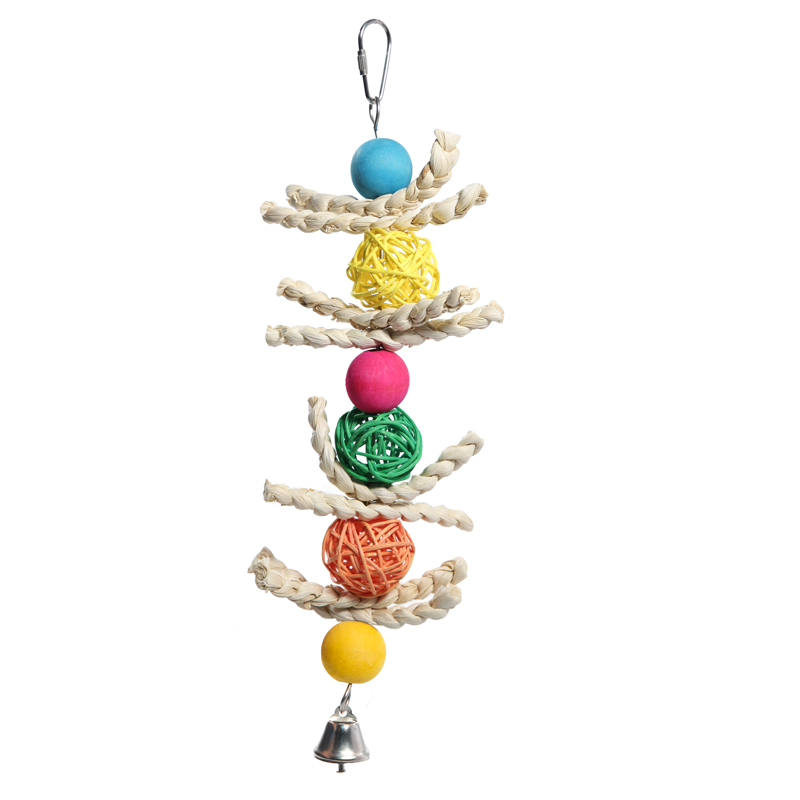 Игрушка-подвеска для птиц в виде трех плетеных и трех деревянных шариков, косичек из кукурузных листьев и колокольчика. Крепление: карабин. Цвет: разноцветный. Размер: 300/330*100мм.