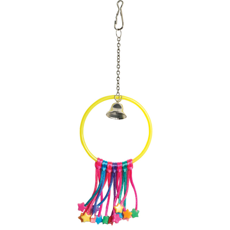 Игрушка для птиц в виде обруча с колокольчиком и подвесками из нитей с бусинками на них. Цвет: в ассортименте. Размер: 290х90мм.
