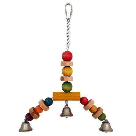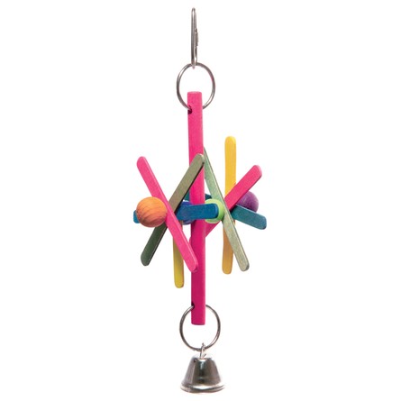 Игрушка для птиц, выполненная в виде палочки с перекладиной, унизанной цветными бусинами, с деревянными вертушками по бокам. Крепление: карабин. Размер: 220/250*90мм.