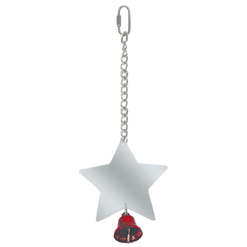 Игрушка для птиц - подвеска в виде зеркала-звездочки с колокольчиком на цепочке. Крепление: карабин. Цвет: серебро. Размер: 195*80мм.