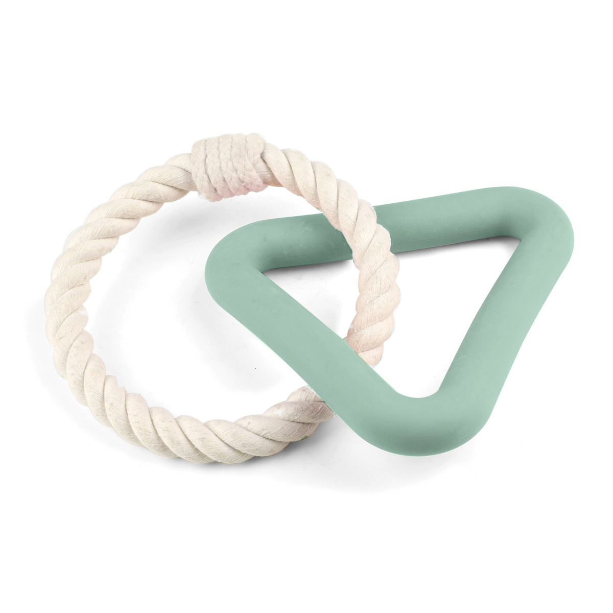 Игрушка в форме треугольника с веревочным мячом выполнена из термопластичного эластомера - инновационного материала, обладающего высокой прочностью, устойчивостью к внешним воздействиям и изменению температуры. Плетеный мяч изготовлен из хлопковых нитей, безопасных для вашего питомца. Сочетание двух материалов в игрушке сделает игру более разнообразной, а приятное цветовое сочетание будет радовать глаз. Цвет изделия: бело-голубой. Вес изделия: 90г. Размер изделия: 120*120*50мм.