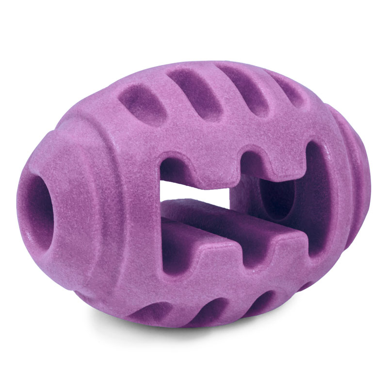 Оригинальная игрушка "Мяч для регби" из термопластичной резины для собак мелких и средних пород. Прочная и в то же время обладающая мягкой структурой, она станет идеальным решением для четвероногих питомцев. Изделие послужит хорошим "напарником" для игры и позаботится о здоровье зубов животного. Тонкий аромат винограда дополнительно привлечет внимание питомца, а наличие отверстий под лакомства позволит сделать игру или тренировку еще интереснее. Цвет изделия: фиолетовый. Размер изделия: d60*80мм.