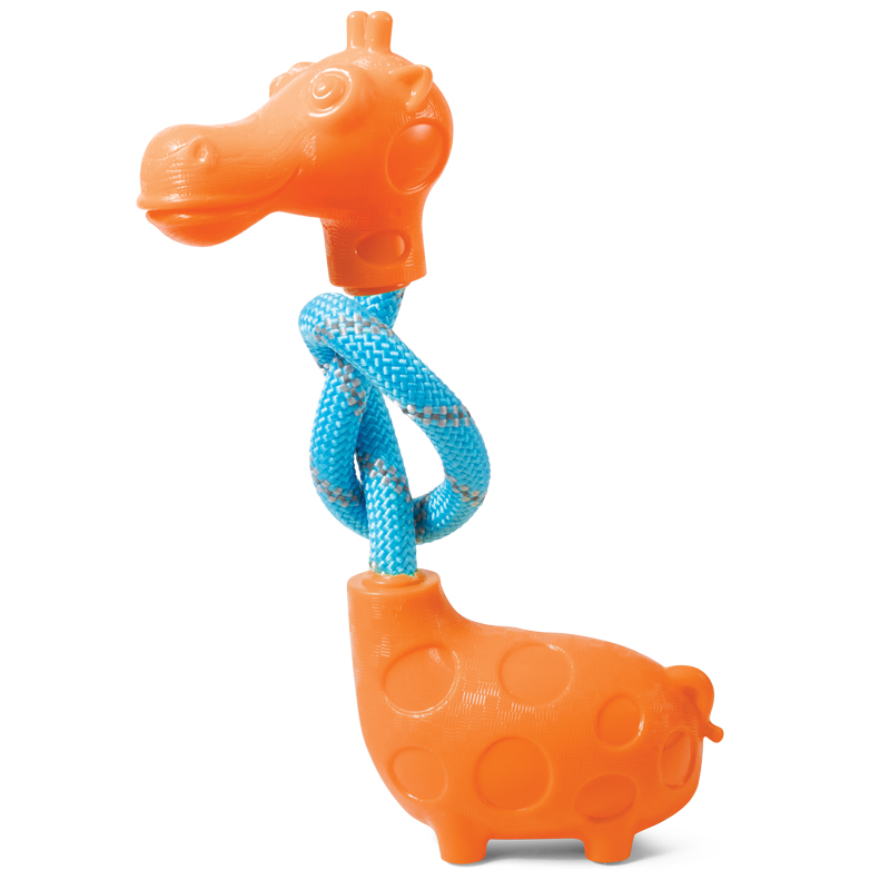 Фактурная игрушка для собак в форме жирафа состоит из 2‑х частей, соединенных массивным шнуром диаметром 10 мм. Тело и голова выполнены из термопластичной резины. Игрушка устойчива к укусам собак средних пород, в т.ч. с массивными челюстями. Идеальная для активных собак мелких и средних размеров, можно использовать как перетяжку. Термопластичная резина сохраняет упругость и эластичность даже при низких температурах и отличается длительным эксплуатационным периодом. Материал мало подвержен химическому или термическому воздействию, не токсичен, без запаха, легко моется и не требует особого ухода. Цвет: "жираф" - оранжевый, веревка - синий. Размер: 235*82*45мм.