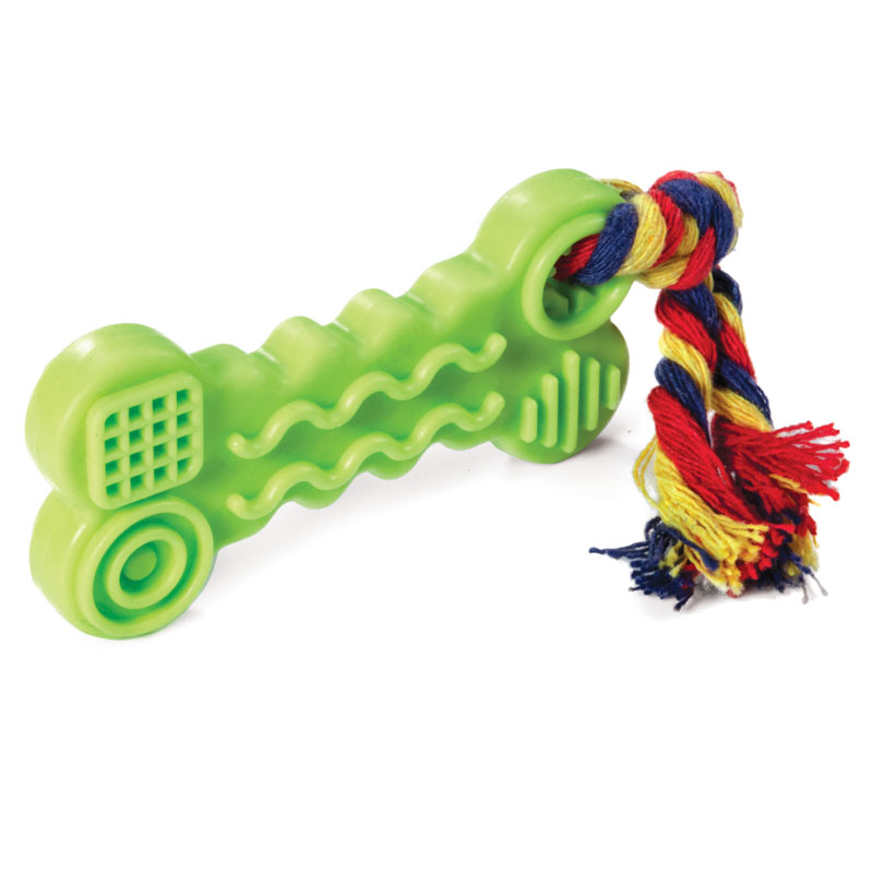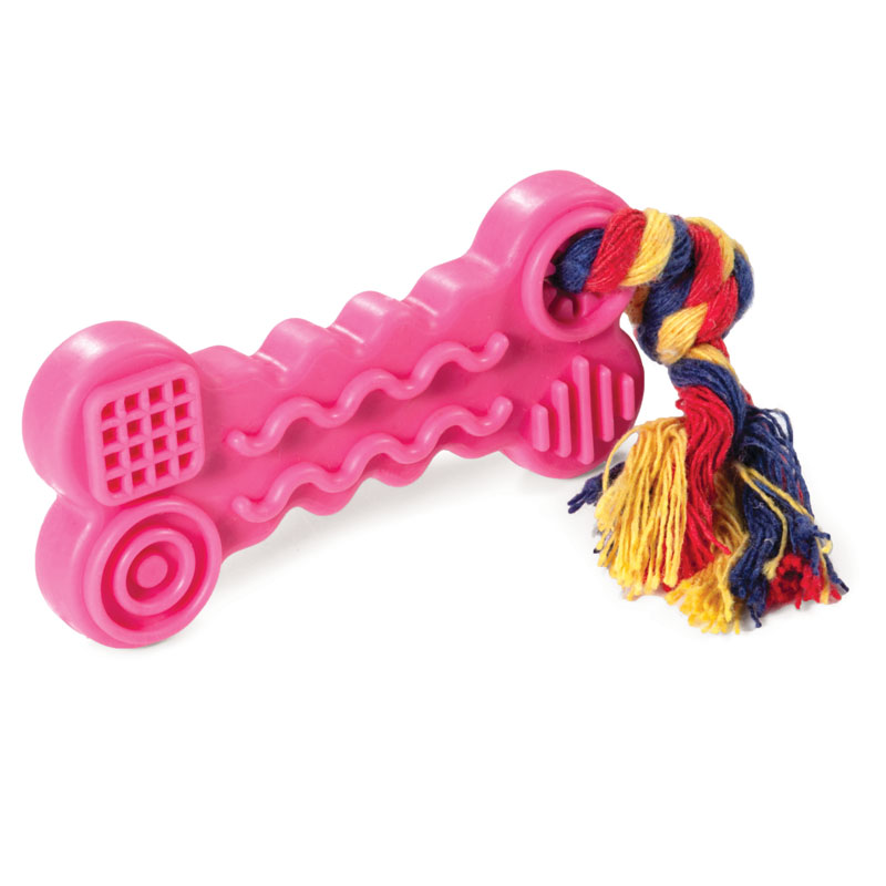 Полноценная жизнь собак – это не только сбалансированное питание и ежедневные прогулки, но и игры. Суперпрочная игрушка в виде косточки для маленьких и средних собак, изготовлена из цельнолитой резины и веревки из хлопка. Благодаря фактурному рисунку на резине, такая игрушка станет незаменимым тренажером для щенков в период прорезывания зубов. Цвет: зеленый, голубой, розовый. Размер: 95*45*15/165мм.