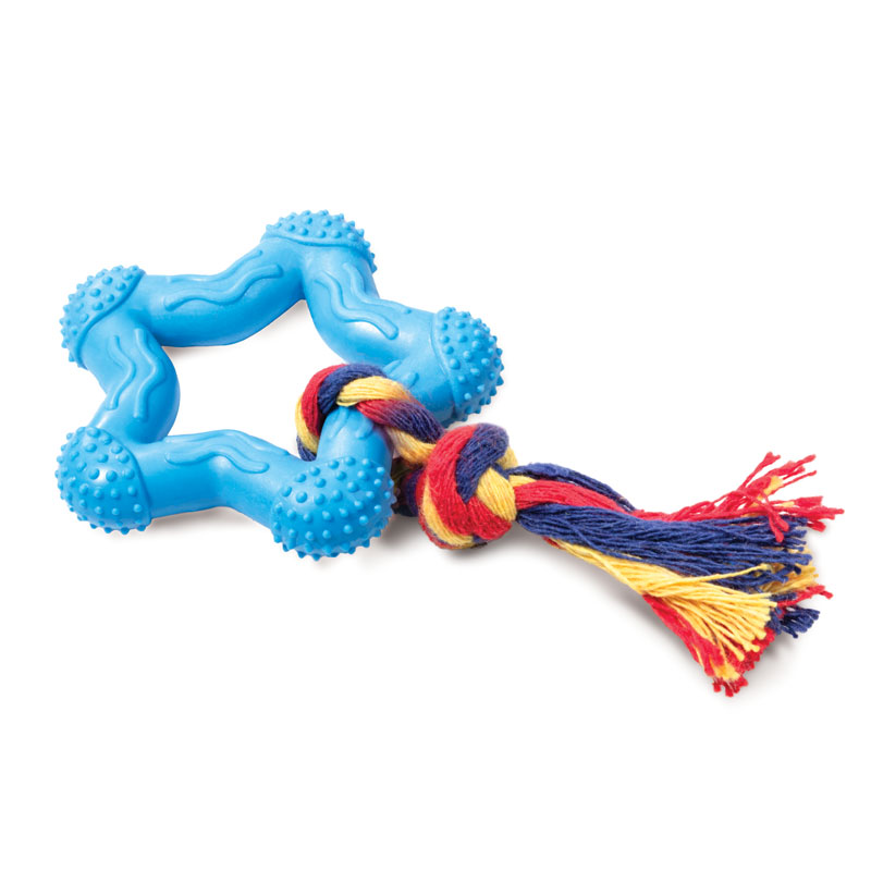 Полноценная жизнь собак – это не только сбалансированное питание и ежедневные прогулки, но и игры. Суперпрочная игрушка в виде звездочки для маленьких и средних собак, изготовлена из цельнолитой резины и веревки из хлопка. Благодаря фактурному рисунку на резине, такая игрушка станет незаменимым тренажером для щенков в период прорезывания зубов. Цвет: зеленый, голубой, розовый. Размер: d75*15/150мм.
