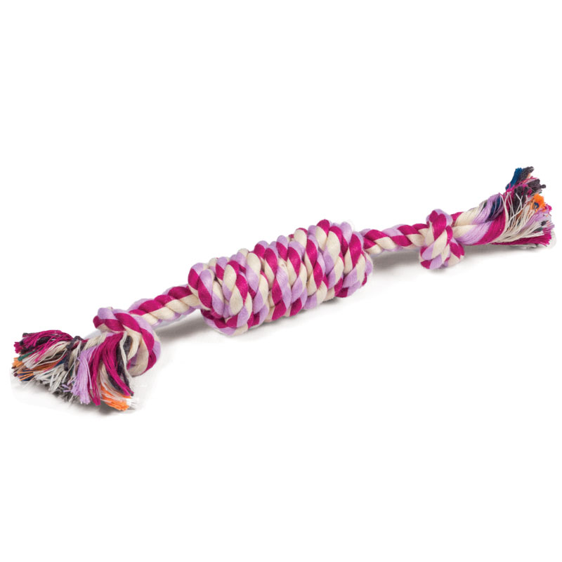 Веревка с двумя узлами предназначена для собак мелких пород, которые обожают играть с такими игрушками, грызть их, трепать и носить в зубах. Веревочные игрушки отлично массируют десны и очищают зубной налет во время игры. Веревка сплетена из нитей натурального хлопка, поэтому безопасна для здоровья Вашего питомца. Цвет: сиреневый. Вес: 30г. Размер: 180*40*30мм.