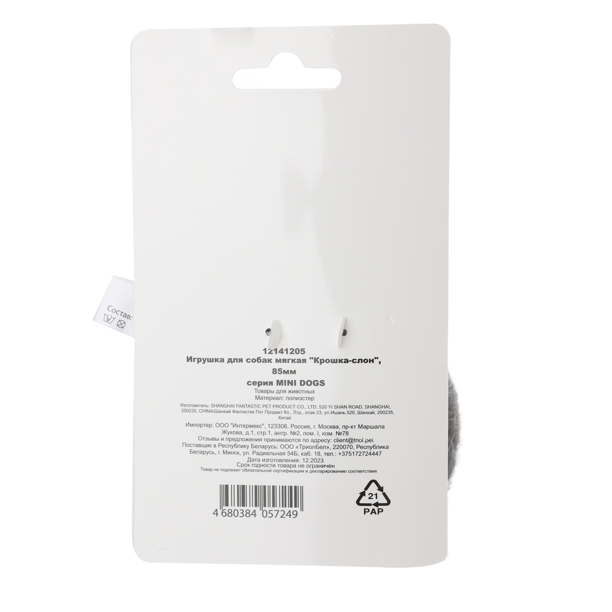 Очаровательная мягкая игрушка "Крошка-слон" идеально подойдет по размеру для собак небольших пород. Игрушка сшита из шелковистого плюша, с мягким шуршащим наполнителем внутри. Цвет: серый с белым. Размеры: 85*30*60мм.