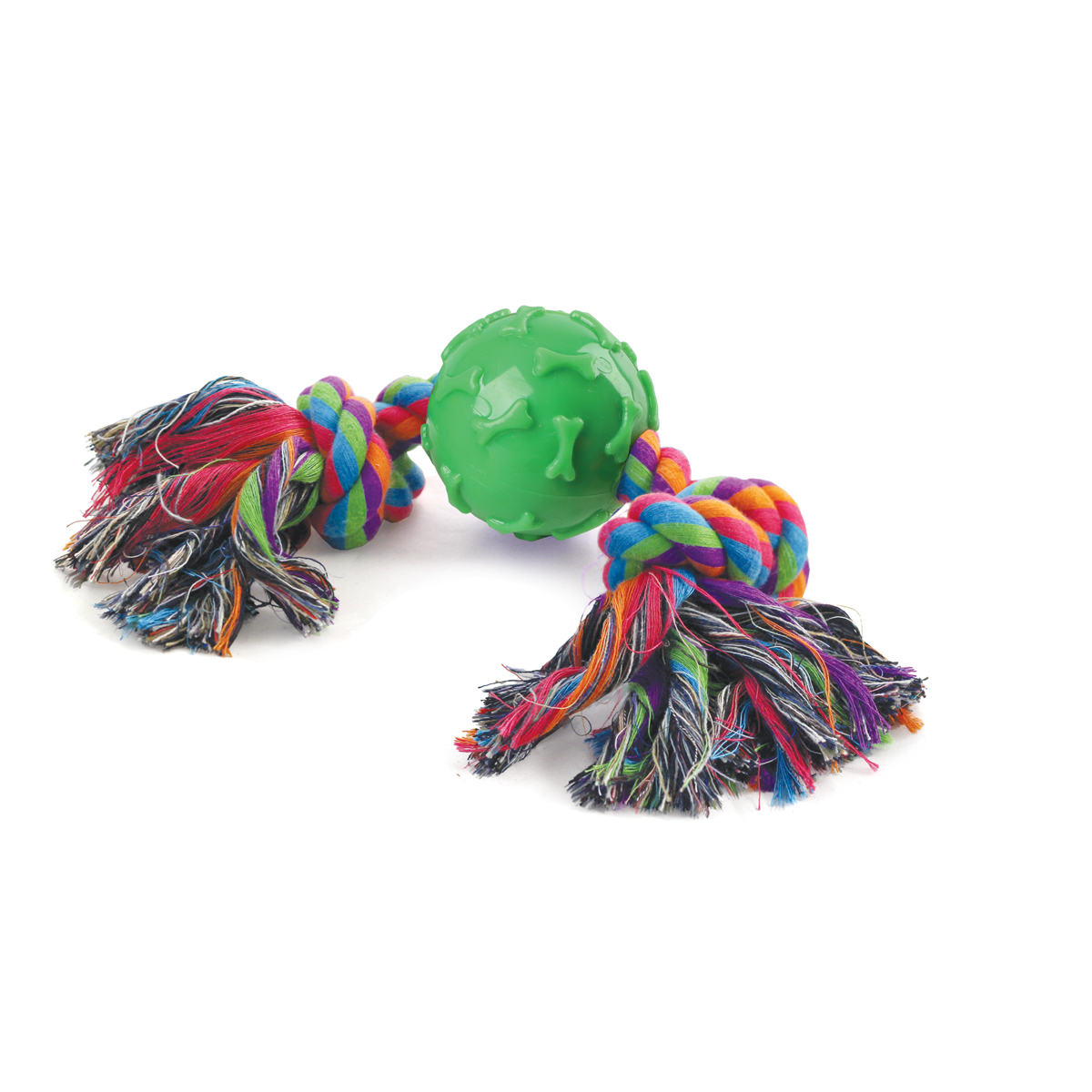 Собаки обожают играть с веревочными игрушками, так как их можно грызть, трепать и носить в зубах. Такие игрушки отлично массируют десны и очищают зубной налет во время игры. Веревки сплетены из нитей натурального хлопка, поэтому безопасны для здоровья Вашего питомца. Цвет: разноцветный. Вес: 140-150г. Длина веревки: 300мм. Размер мяча: d65мм.