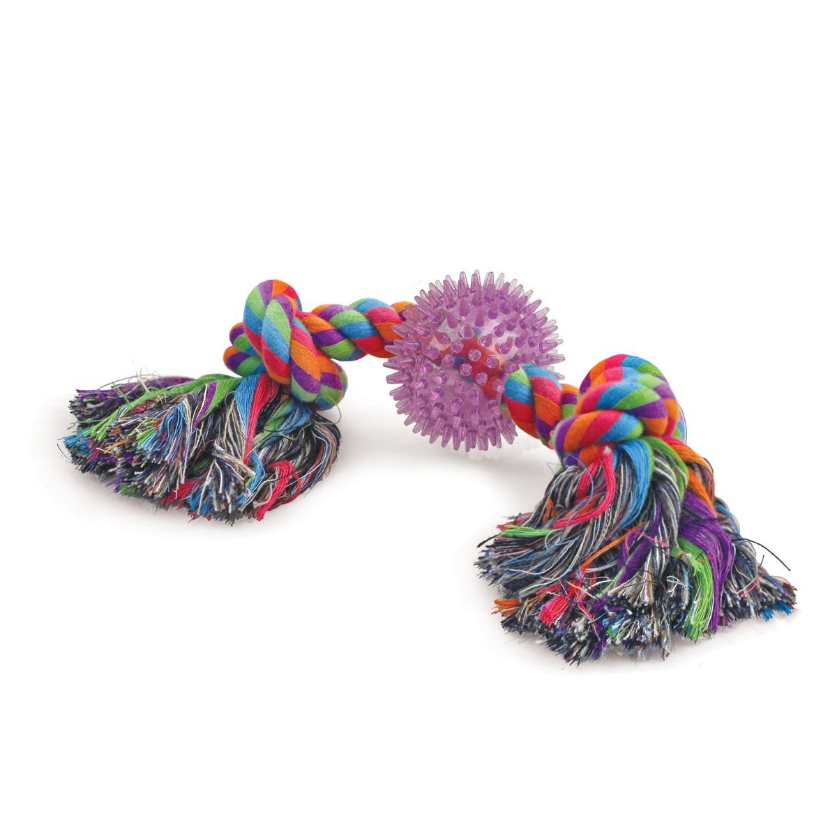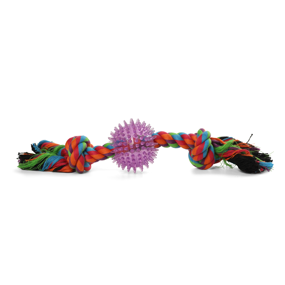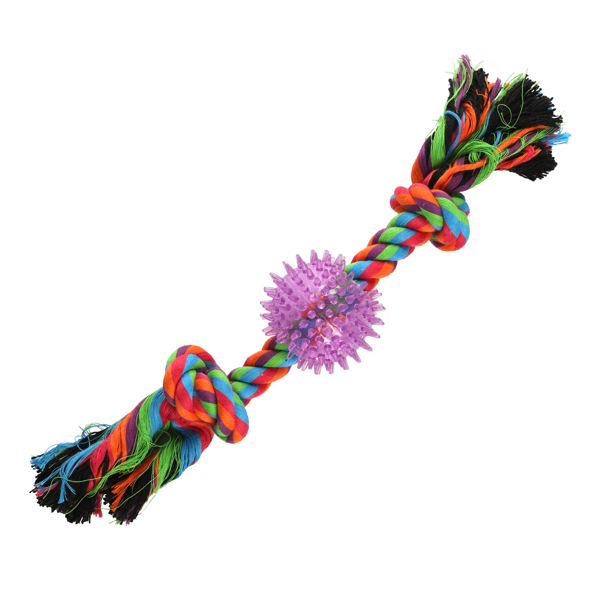 Собаки обожают играть с веревочными игрушками, так как их можно грызть, трепать и носить в зубах. Такие игрушки отлично массируют десны и очищают зубной налет во время игры. Веревки сплетены из нитей натурального хлопка, поэтому безопасны для здоровья Вашего питомца. Цвет: разноцветный. Вес: 250-260г. Длина веревки: 350мм. Размер мяча: d65мм.