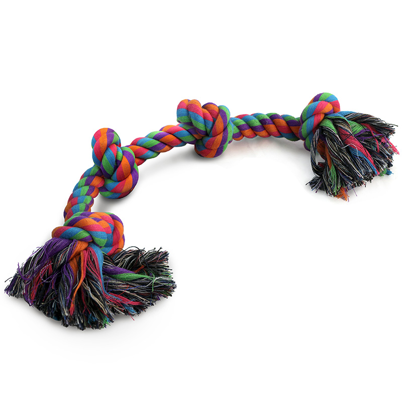 Собаки обожают играть с веревочными игрушками, так как их можно грызть, трепать и носить в зубах. Такие игрушки отлично массируют десны и очищают зубной налет во время игры. Веревки сплетены из нитей натурального хлопка, поэтому безопасны для здоровья Вашего питомца. Цвет: разноцветный. Вес: 330-340г. Длина веревки: 540мм.
