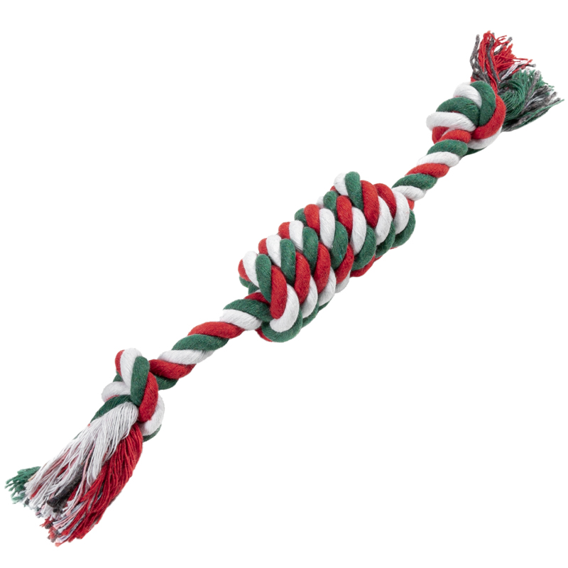 Веревочная игрушка с узлами - лучший способ поздравить четвероногого любимца с праздником! Собаки обожают играть с веревочными игрушками, так как их можно грызть, трепать и носить в зубах. Такие игрушки отлично массируют десны и очищают зубной налет во время игры. Веревки сплетены из нитей натурального хлопка, поэтому безопасны для здоровья питомца. Цвет изделия: микс белого, красного и зеленого. Размер изделия: 250*35*35мм.