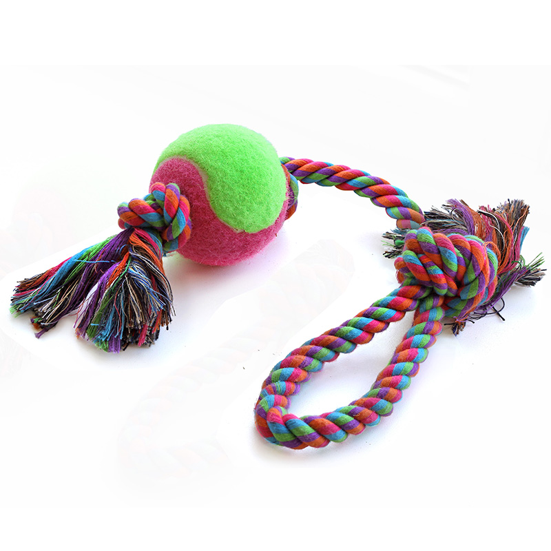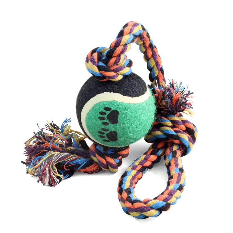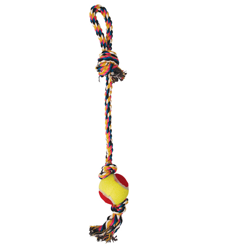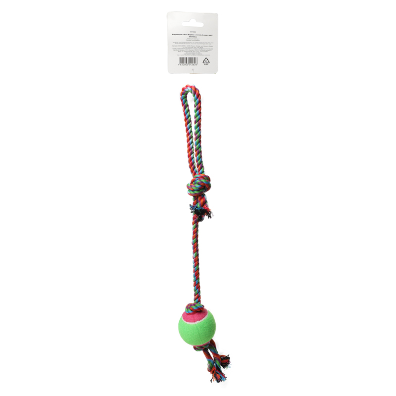 Собаки обожают играть с веревочными игрушками, так как их можно грызть, трепать и носить в зубах. Такие игрушки отлично массируют десны и очищают зубной налет во время игры. Веревки сплетены из нитей натурального хлопка, поэтому безопасны для здоровья Вашего питомца. Цвет: разноцветный. Вес: 250-260г. Длина веревки: 350мм. Размер мяча: d65мм.