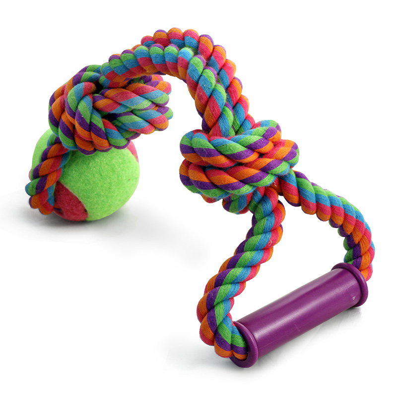 Собаки обожают играть с веревочными игрушками, так как их можно грызть, трепать и носить в зубах. Такие игрушки отлично массируют десны и очищают зубной налет во время игры. Веревки сплетены из нитей натурального хлопка, поэтому безопасны для здоровья Вашего питомца. Цвет: разноцветный. Вес: 270-280г. Длина веревки: 400мм. Размер мяча: d65мм.