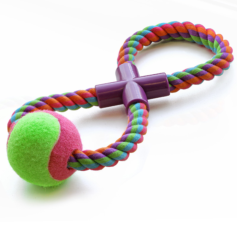 Собаки обожают играть с веревочными игрушками, так как их можно грызть, трепать и носить в зубах. Такие игрушки отлично массируют десны и очищают зубной налет во время игры. Веревки сплетены из нитей натурального хлопка, поэтому безопасны для здоровья Вашего питомца. Цвет: разноцветный. Вес: 270-280г. Длина веревки: 400мм. Размер мяча: d65мм.