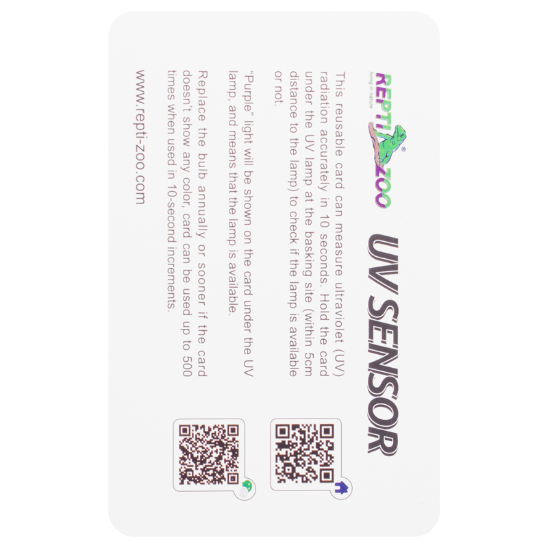 Тестовая карта многоразового использования предназнаена для проверки присутствия ультрафиолетового излучения. Для того, чтобы определить наличие УФ-излучения в общем световом потоке лампы, необходимо в течение 10 секунд подержать карту на расстоянии 5 сантиметров от лампы. Изменение цвета карты на фиолетовый означает присутствие в световом потоке УФ-излучения. Количество использований карточки - до 500 раз длительностью не более 10 секунд. Карта поможет правильно определить момент, когда нужно заменять ультрафиолетовую лампу в террариуме.