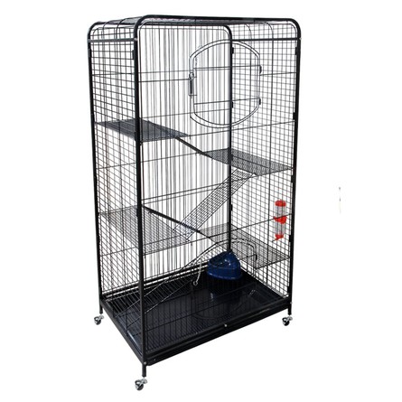 Клетка-вольер для животных (хорьков, белок, шиншилл, крупных дегу, крыс) с выдвижным пластиковым поддоном с высокими бортиками, который максимально упрощает процесс уборки. На фасаде клетки имеются две большие удобные дверцы с надежными запирающими механизмами. Комплектация: 4 полки, 4 лесенки, автопоилка объемом 250 мл и миска. Расстояние между прутьями 2,5 см. Бесшумное и аккуратное передвижение по комнате обеспечивают съемные шарообразные колеса. Цвет: черный металлик. Размер изделия: 790х525х1400мм.