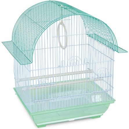 Оригинальная клетка для птиц с фигурной крышей - полезный аксессуар для владельцев пернатых питомцев. Надежная, просторная и очень удобная, такая клетка займет достойное место в любом интерьере, отвечая всем жизненным потребностям домашних любимцев. В комплектацию изделия входят 2 кормушки, 2 пластиковые жердочки и качели. Клетка оборудована удобной ручкой для переноски и специальным пластиковым наружным поддоном, облегчающим процесс уборки. Цвет: голубой, зеленый, сиреневый. Размер изделия: 345*260*440мм.