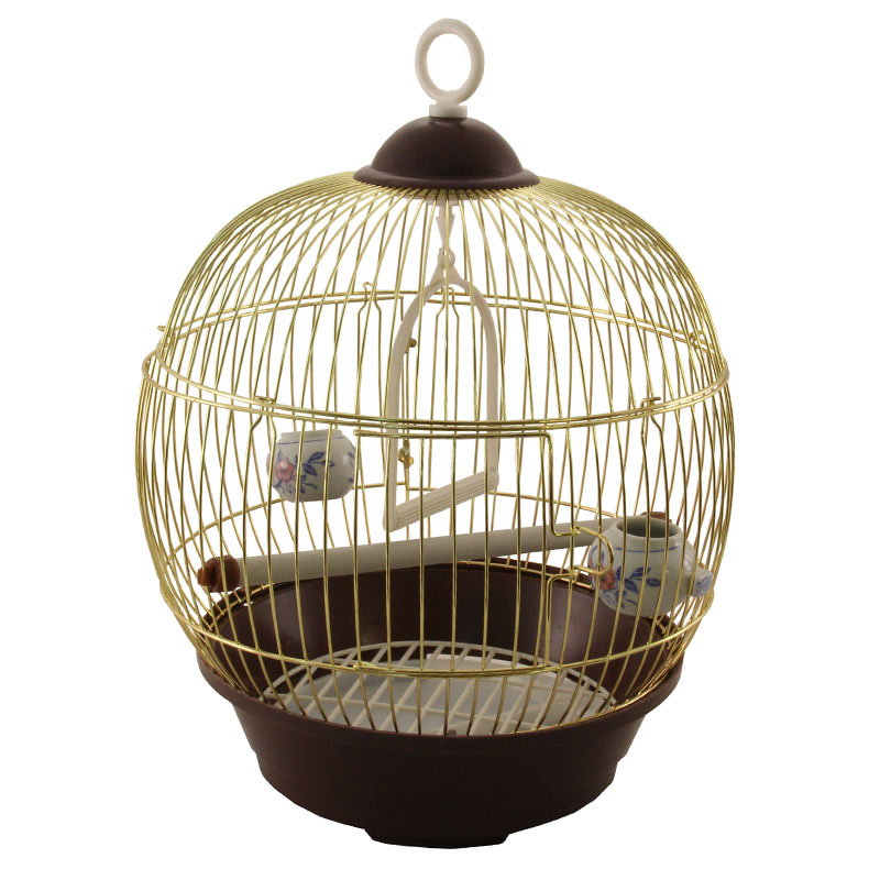 Круглая эмалированная клетка для птиц - универсальный аксессуар для владельцев пернатых питомцев небольших размеров. Прочная и удобная, такая клетка занимает совсем немного места и отвечает всем потребностям пернатых. В комплектацию изделия входят пластиковые кормушки, жердочка и качели. Клетка оборудована удобной ручкой для переноски и специальным пластиковым наружным поддоном, облегчающим процесс уборки. Цвет: золотой/коричневый. Размер изделия: 230х230х365мм.