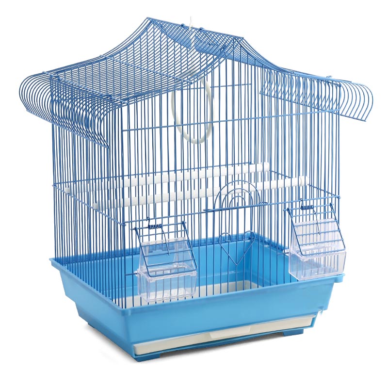Оригинальная клетка для птиц с фигурной крышей - полезный аксессуар для владельцев пернатых питомцев. Надежная, просторная и очень удобная, такая клетка займет достойное место в любом интерьере, отвечая всем жизненным потребностям домашних любимцев. В комплектацию изделия входят 2 кормушки, 2 пластиковые жердочки и качели. Клетка оборудована удобной ручкой для переноски и специальным пластиковым наружным поддоном, облегчающим процесс уборки. Цвет: голубой, сиреневый, зеленый. Размер изделия: 345*260*440мм.