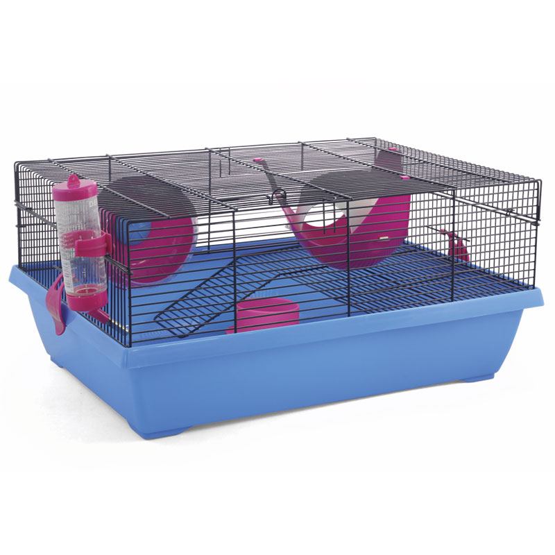 Клетка прямоугольной формы с округлой крышей - удобный и функциональный дом для любого грызуна: он занимает совсем немного места и отлично подходит для мелких домашних животных вроде крыс, мышей и хомяков. В комплектацию изделия также входят: пластиковая миска, уютный домик, беговое колесо и две пластиковые лесенки. Кроме того, клетка оборудована удобной ручкой на крыше, облегчающей процесс переноски изделия, и специальным пластиковым наружным поддоном, облегчающим процесс уборки. Цвет: голубой, сиреневый, морской волны. Размер изделия: 580*320*410мм.